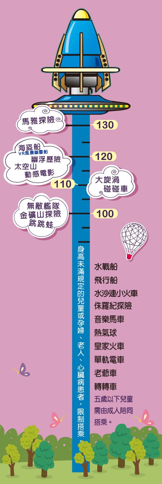 基本上有120cm幾乎都能體驗 但是噗噗一家人很膽小 不敢玩太刺激的設施